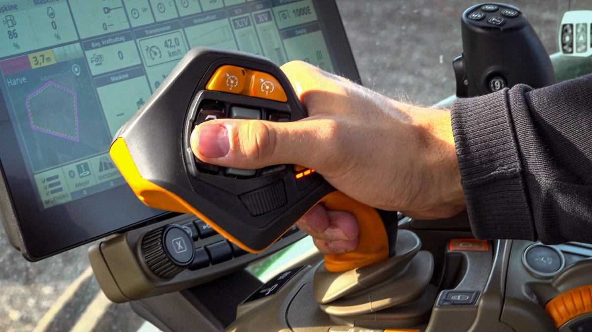 - Den har krybefunktioner og en følsomhed, der hurtigt falder naturligt, så man let kan styre traktoren ind til et redskab, frem med sneglevognen eller gribe en sten. Håndtaget klarer det virkelig godt, fortæller han.