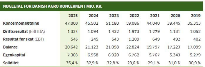 Grovvareselskabet Danish Agro har formået at vende den negative skude, og mere end fordobler sit resultat før skat til 546 millioner kroner kontra 245 millioner kroner i 2024. Koncernens omsætning lander på 47 milliarder kroner, hvilket er højere end budgetteret og 3 procent højere end i 2024. Driftsresultatet (EBITDA) endte på 1,3 milliarder kroner i 2025, hvilket er det tredjehøjeste niveau i koncernens historie og 230 millioner mere end i 2024.