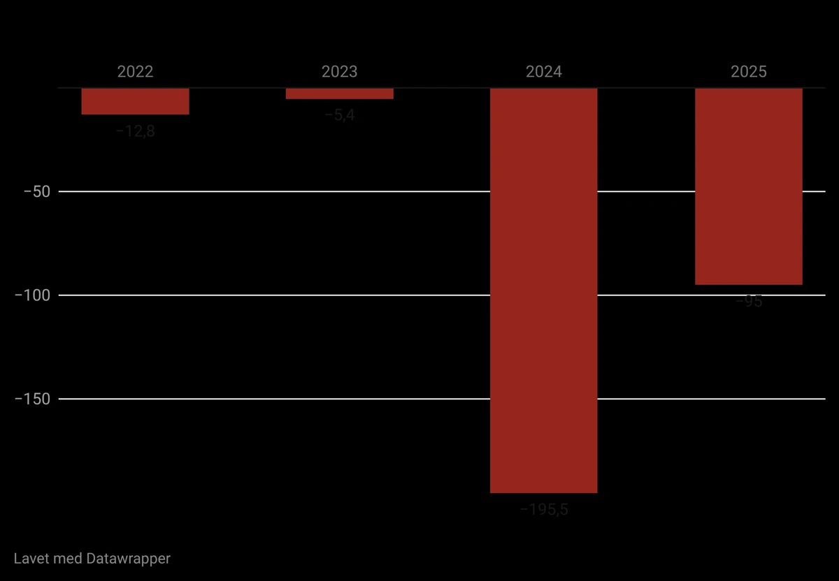 Trods en forbedring af bundlinjen er der stadig tale om et underskud, hvor resultatet er steget fra -195,5 millioner kroner til -95,5 millioner kroner.