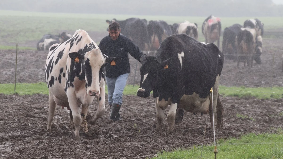 De knap 100 sortbrogede holstein-køer græsser dog ligeglade med regnen ude på den kraftige græsmark.