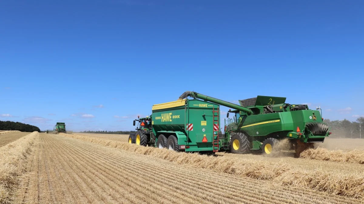 På Gavnø Gods kører de to 30 fods John Deere-mejetærskere torsdag middag i vårbyg.