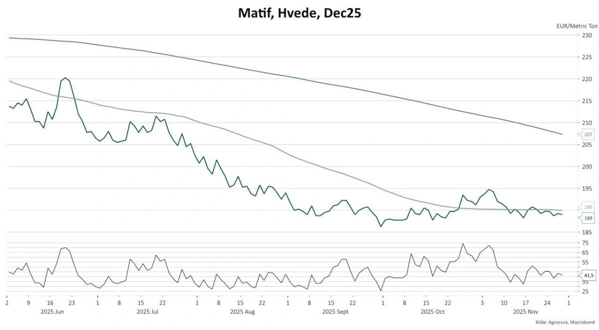 Det europæiske hvedemarked har fået den fulde tur i år. Høstperioden i sensommeren slog prisen i knæ, og som grafen viser, var det ikke et elegant knæk – det var et vaskeægte høstpres, hvor markedet blev oversvømmet af korn. Når store mængder rammer markedet på én gang, reagerer de fysiske priser og børspriserne instinktivt: De går ned.