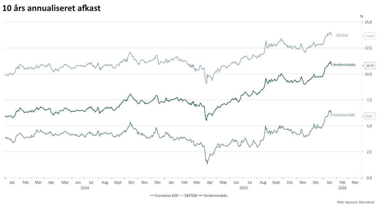 Grafen viser 10 års annualiseret afkast, hvilket kort fortalt betyder: hvis de sidste 10 års afkast blev »glattet ud« til én fast årlig rente – hvor høj ville den så være lige nu? Det er altså ikke afkastet i 2024-2026, men en løbende temperaturmåling på, hvad 10 års aktieafkast svarer til om året.