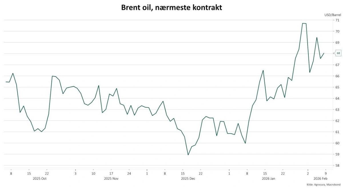 Den seneste prisgraf for Brent, nærmeste kontrakt, viser et tydeligt regimeskifte: fra et marked styret af udbud og efterspørgsel til et marked drevet af geopolitisk usikkerhed og risikopræmie.