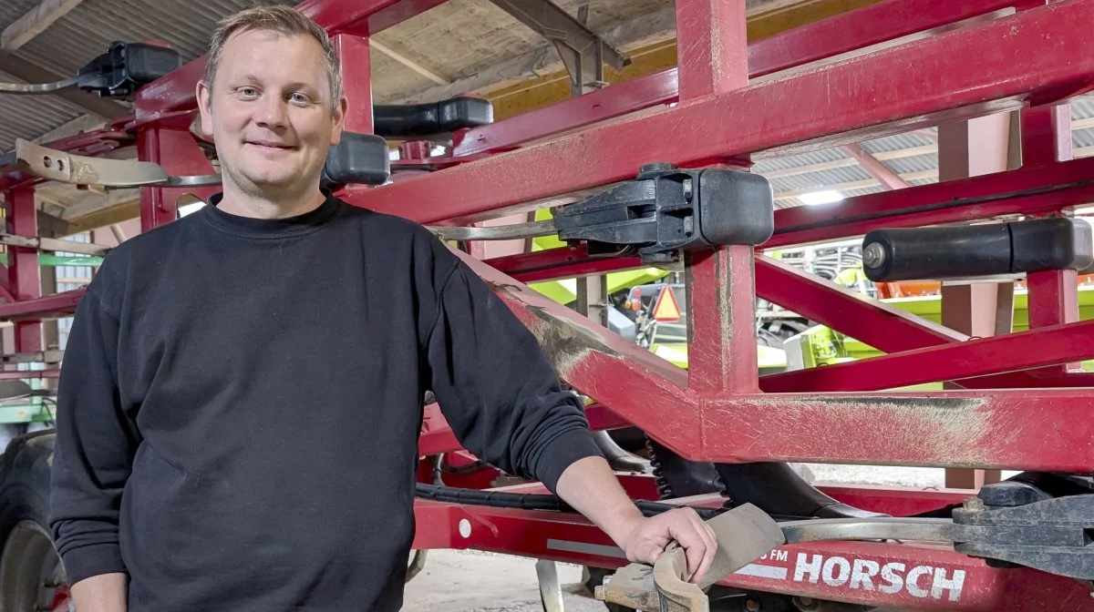 - Hidtil har vi sået raps med vores Horsch Terrano dybdeharve med såudstyr. Men ikke mindst i takt med den større interesse for direkte såning og måske også kommende krav i forbindelse med CO2-afgiften, har vi her til den forestående sæson anskaffet denne nye såmaskine, der skal så stort set alt.