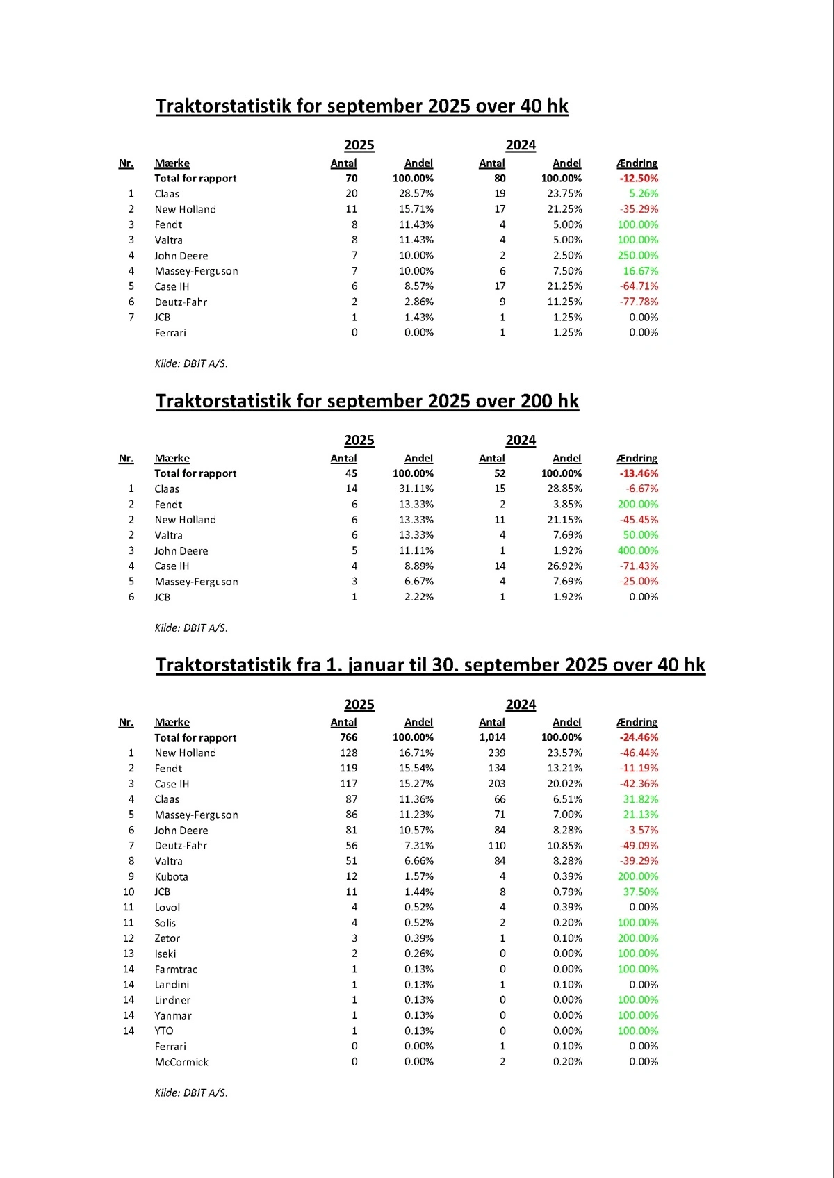 Efter en kortvarig fremgang i august faldt traktorsalget igen i september. Under 100 traktorer blev nyregistreret i over 40 hk-segmentet, og markedet er fortsat presset. Claas topper som månedens mest solgte mærke, mens New Holland holder fast i førertrøjen på årsbasis.