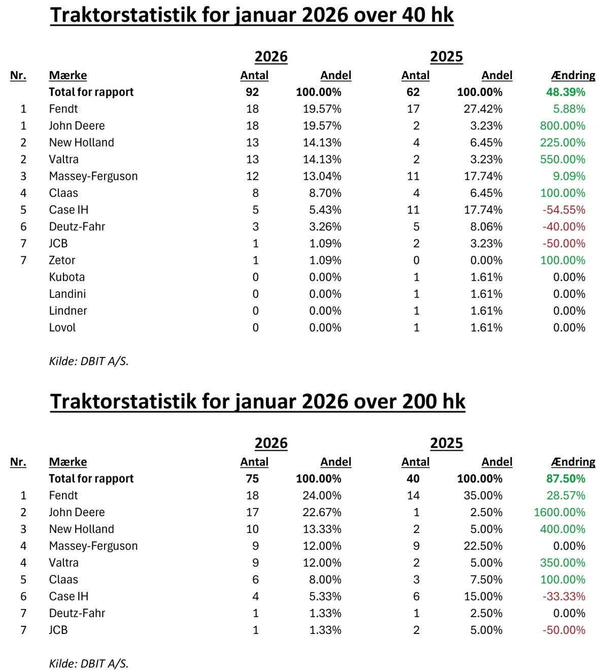 2026 fik en markant bedre start for traktorsalget i Danmark end året før. Ifølge den seneste traktorstatistik blev der i januar måned nyregistreret 92 traktorer over 40 hk, mod 62 i januar 2025. Det svarer til en fremgang på knap 50 procent og giver et løft til et marked, der ellers har været præget af tilbageholdende investeringer gennem 2024 og 2025.