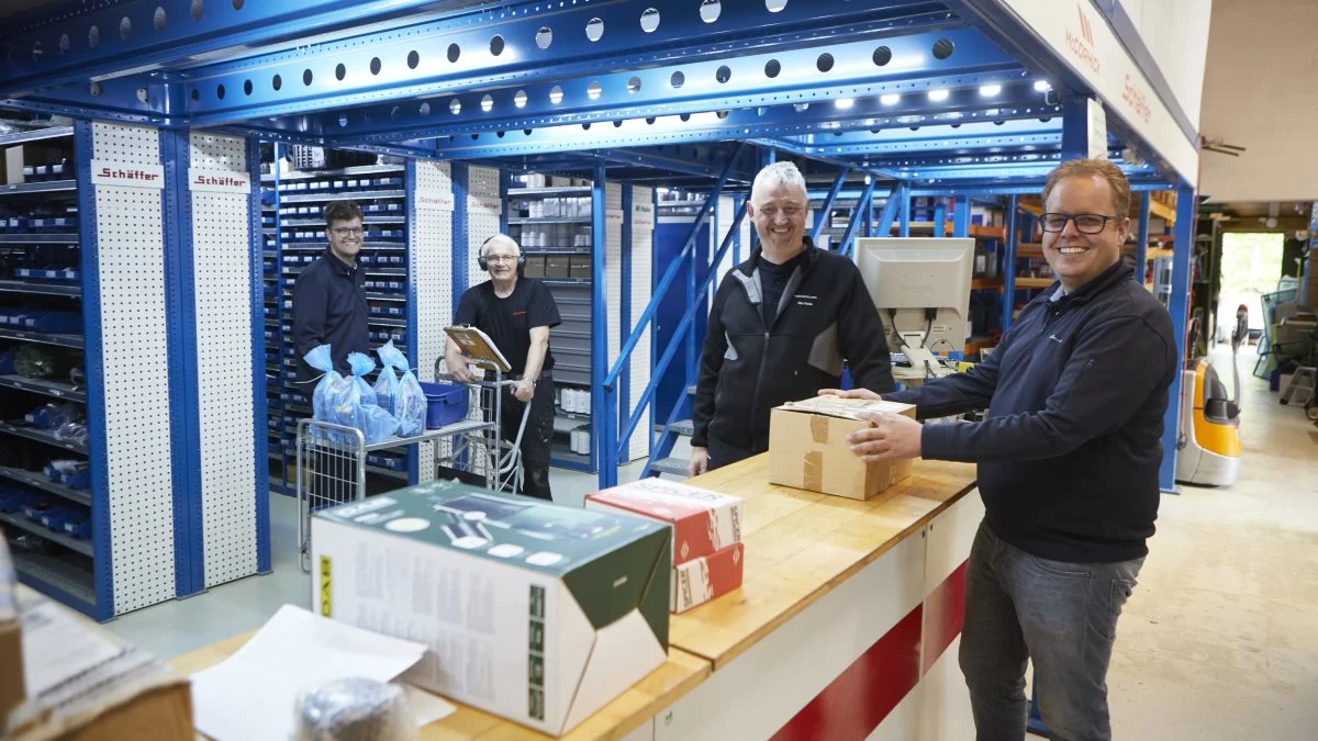 Jakob (tv.) og Allan Helms til højre overtager 1. juni det fulde ejerskab af familievirksomheden. På reservedelslageret er de her sammen med to af de i alt 40 medarbejdere, Henning Fjord Olesen og Ole Hede.