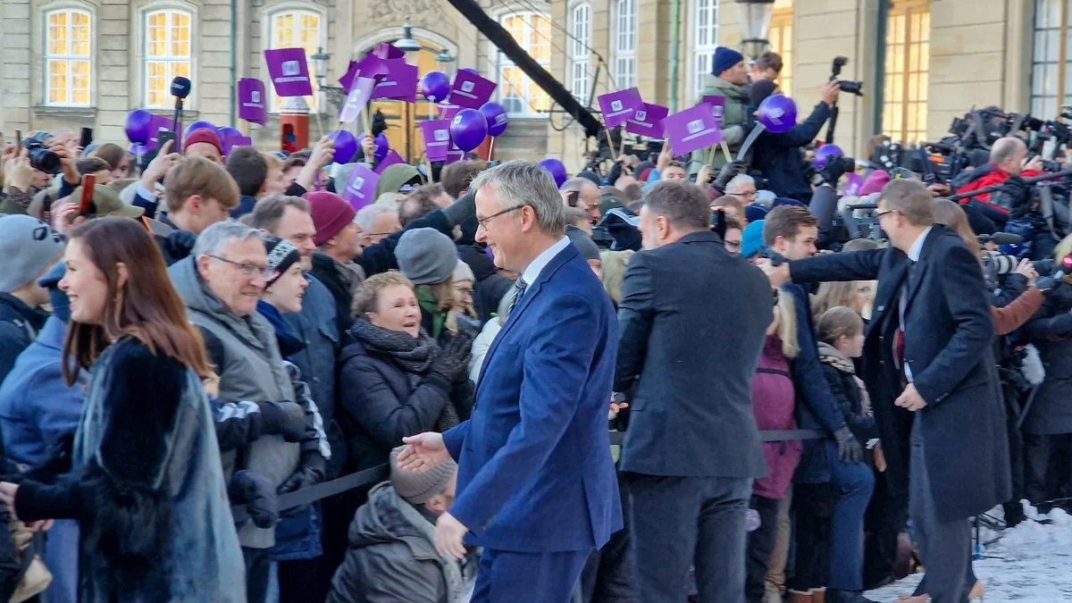 Det nye ministerhold blev traditionen tro præsenteret på Amalienborg, hvor Jacob Jensen her ses forrest i blåt jakkesæt. Foto: Jørgen P. Jensen
