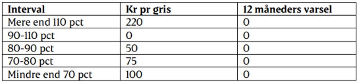 Når masken er aktiv, accepteres der et spænd i leveringerne på +/- 10 procent ud fra 13 ugers rullende gennemsnit under hensyn til normale leveringsmønstre af hensyn til biologiske udsving. Fradraget vil minimum være 50 kroner pr. gris og maksimalt 220 kroner pr. gris (se faktaboks).