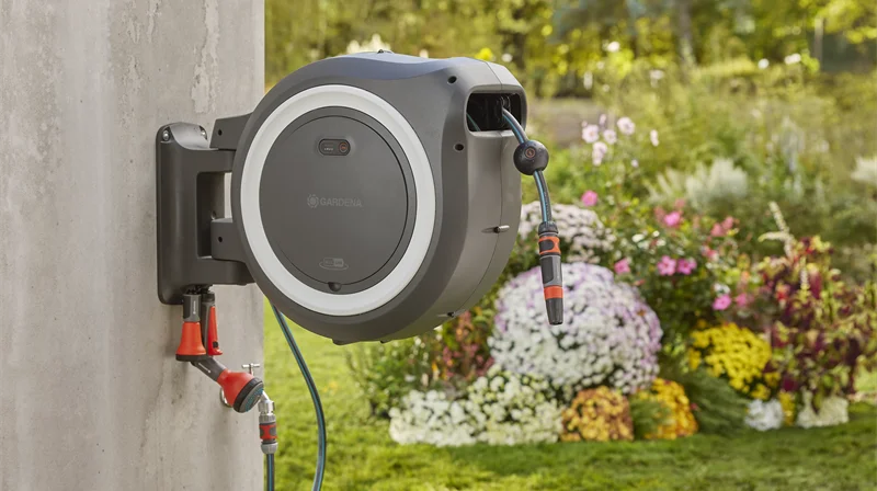 - Vægmonteret slangeboks PowerRoll: Tilbyder frihed og fleksibilitet samt maksimal bekvemmelighed til vanding. Takket være det genopladelige batteri rulles slangen automatisk og jævnt op med et tryk på en knap.