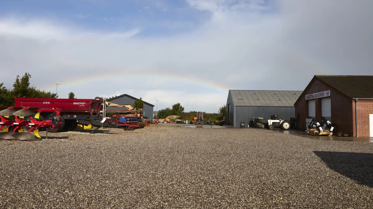 Med regnbuen som smuk baggrund Hadsten Maskiner med de to udstillingshaller, opført i 2020 og 2022.